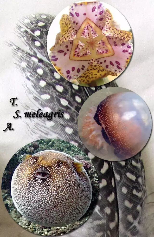 麦莱亚戈的各色姐妹们。背景是珠鸡羽毛,属名缩写:T. - Tigridia meleagris斑点虎皮花;S. - Stomolophus meleagris沙蜇;A.- Arothron meleagris白点叉鼻鲀。图片:sacredibis / Deviantart;T.López Orihuela / iNaturalist;S. Bill Keim / Flickr;A. Bill Eichenlaub / NPS。制图:紫鹬