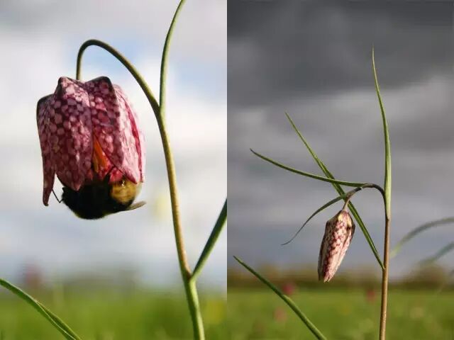 一只熊蜂正在为花格贝母传粉。而阴霾的天空下,未开放的低垂花蕾启发了它的英文俗名——“蛇头”(Snake’s head)。图片:purperlibel / iNaturalist