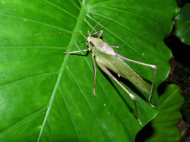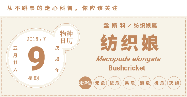我们今天要介绍的纺织娘,学名Mecopoda elongata,又称中华纺织娘。这个种很好认,头小翅膀大,身体两侧复眼后方各有一块黑斑,有绿色和褐色两种色型,主要以植物为食,昼伏夜出。