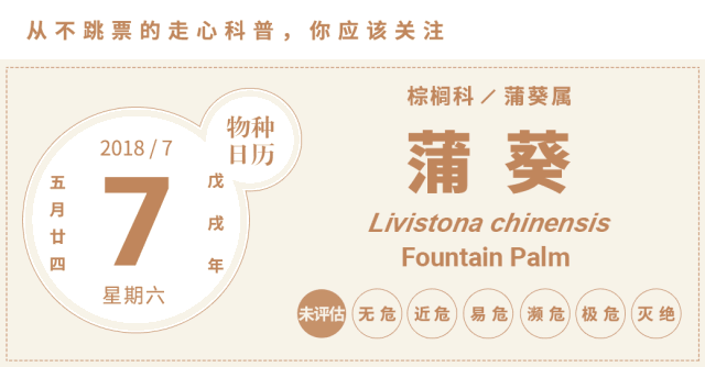 蒲葵所在的蒲葵属是棕榈科大家族中的一个小分支,整个属的成员并不多,只有30个,在中国分布的只有蒲葵、大叶蒲葵和美丽蒲葵这三个种,其中最多见的当属蒲葵了。