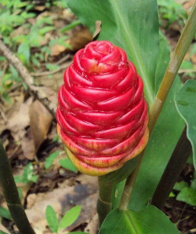 这是为什么呢?原来,豆蔻属植物的花序,是直接从根茎处生长出来的,接近于地面;而山姜属植物的花序则是从枝端生出的。农历二月时节,正是山姜育苞抽苔的时节,那串白中透粉的花苞娇嫩欲滴,由此有了“豆蔻梢头二月初”之句。