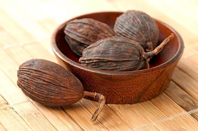 草果的果实呈两头稍尖的椭球形,截面略呈三棱形,而且身上也具有很多凸凹不平的沟槽。草果里面含有几十粒聚在一团、有棱有角小黑石子一般的种子。