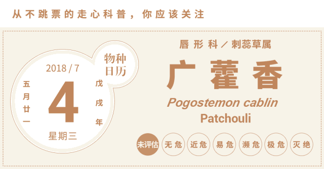 广藿香和藿香这两种植物,不仅名字相似,分类上也都是唇形科的。广藿香(Pogostemon cablin)是唇形科刺蕊草属(Pogostemon)的多年生草本或半灌木,原产于亚洲的热带地区,包括东南亚及印度等地,广藿香的英文名称Patchouli就是来自19世纪泰米尔语中的pacc̣uli。