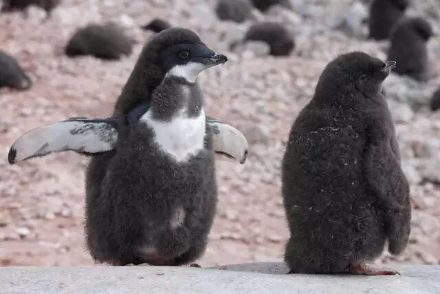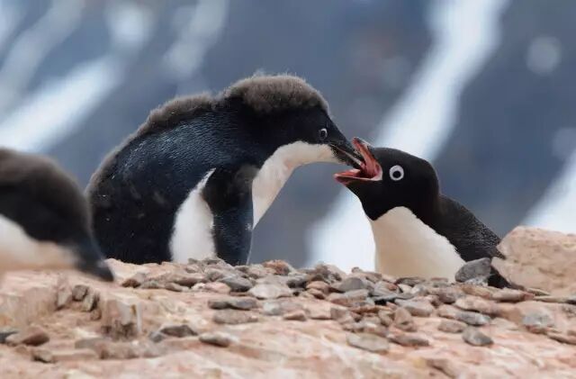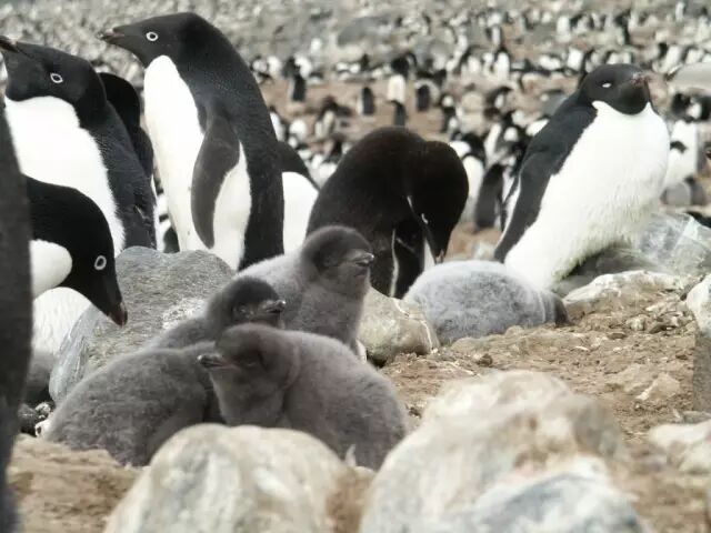 这种好日子没多久。阿德利企鹅毕竟是最靠南的企鹅,所以它在繁殖地停留的时间也最短。阿德利企鹅的幼崽出生不到两个月就必须和父母一起下海离开,相比之下巴布亚企鹅(Pygoscelis papua)的幼崽可以在陆地上窝三个半月,悠闲多了。综合起来,一只阿德利企鹅每年只在繁殖地度过四到五个月时间,而有的金图企鹅全年都赖在繁殖地附近不走。