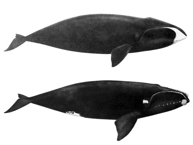 弓头鲸(上)和北大西洋露脊鲸Eubalaena glacialis(下)的外形。图片:National Marine Fisheries Service