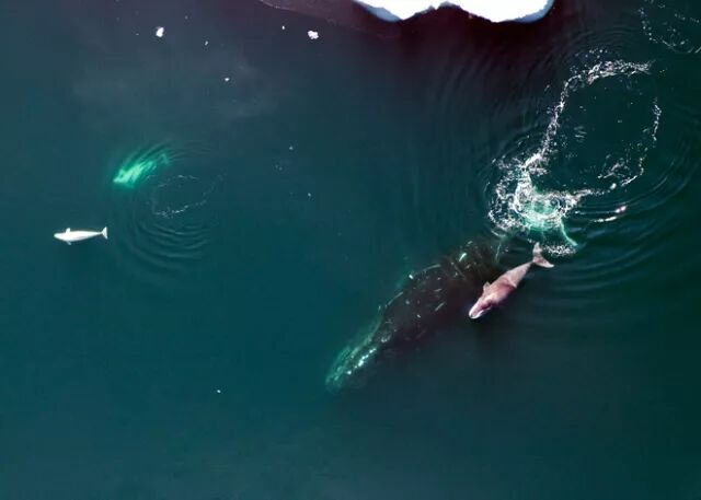 海冰之间的弓头鲸母子和一对白鲸。图片:Corey Accardo / afsc.noaa.gov