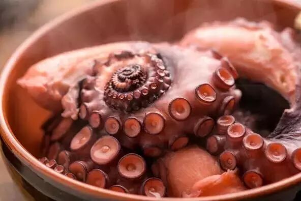 章鱼几乎没有需要丢弃的部分,腕足、肠胃、腮都可以食用,与我们熟悉的鱿鱼略不同,章鱼煮熟后口感更加绵软。头足纲生物体内累积了大量的氨基酸和肝糖,氨基酸提供了层次丰富的鲜味,而本身无味的肝糖加热后可以营造出一种黏韧且结实的口感,并且能缓慢转变成为甜味分子。