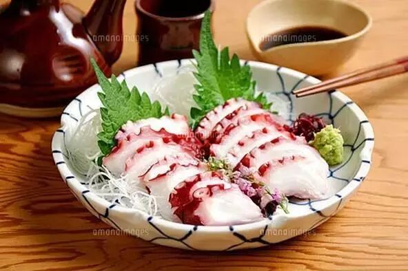 一般章鱼刺身也不会完全选用生的章鱼,而是用热茶烫煮章鱼,烫到肉色微微发白就好。浸过茶后表皮会变为迷人的棕红色,取出迅速放入冰块中,切成拨片就成了刺身,表层是熟的,里面依然生的,一口咬下去,章鱼的清爽鲜美就在齿间扩散开来,越嚼越甜。