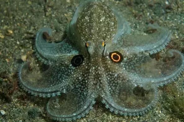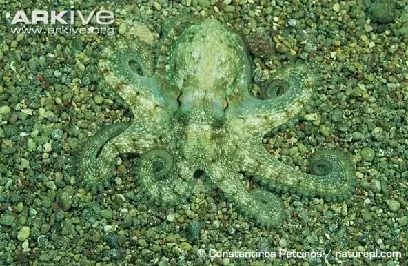 常见的章鱼还有短蛸(O. ocellatus)又称短爪章鱼、望潮,市面上常叫它小章鱼,显著特征是触手之间有两个金色的环斑和两眼之间的长方形花纹。