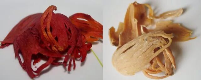 红艳艳的新鲜假种皮与晒干后的假种皮。图片:Atudu & Jastrow / wikimedia