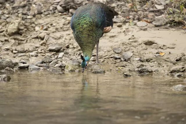 在河边饮水的绿孔雀。图片:庄小松 / 野性中国