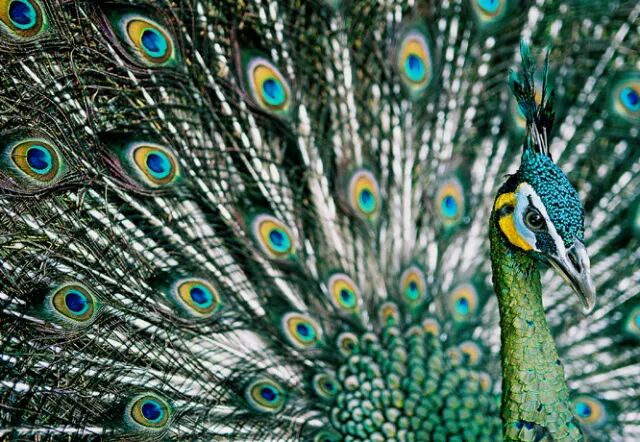 来对比下蓝孔雀(上)、绿孔雀(下)雄鸟。上图:Pixabay;下图:Bob Martinka / flickr