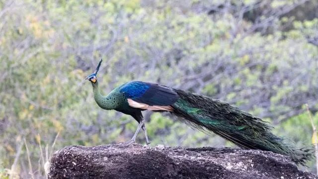 绿孔雀一般早上和下午在林间和河滩觅食,中午和晚上则飞到较高的树枝上休息。