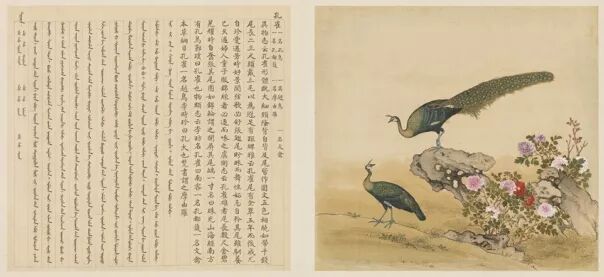 绿孔雀灵魂画作,雌鸟(左)和雄鸟(右)。图片:Ornithologia (Ulisse Aldrovandi, 1599)
