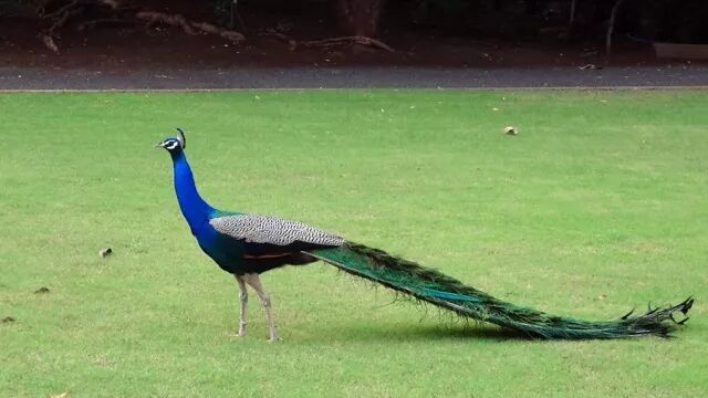 比如,绿孔雀的羽冠是直立的簇状,蓝孔雀则是扇形羽冠;绿孔雀头后部有一块明显的黄色裸皮,蓝孔雀没有;绿孔雀颈部有绿色鳞片状斑纹,蓝孔雀的颈部则是纯蓝色;绿孔雀的两翼收拢后是深蓝色的,蓝孔雀收拢的两翼则密布白、褐相间的斑纹;绿孔雀身材高挑,有显眼的“大长腿”(其实是很长的跗跖),而蓝孔雀则“个矮腿短”……