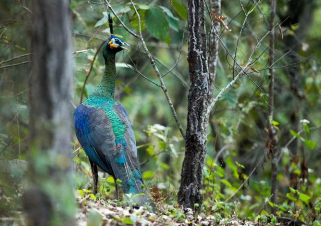 藏在灌丛中的绿孔雀。图片:奚志农 / 野性中国