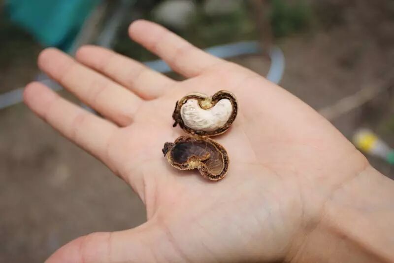 为什么这么受欢迎的腰果,却从来没见过带壳卖的呢?其实很简单,腰果壳是有毒的。这种漆树科植物有自己的“防身”利器——腰果壳油。腰果壳油中含有以腰果酚为代表的一些化学物质,可以侵蚀人的皮肤,这也是腰果所在的漆树科植物所共有的特点。据说,腰果最初就是当做毒药来使用的。爱嗑坚果的小伙伴们一定伤心了,完全没有办法享受“嗑”腰果的快感呢。