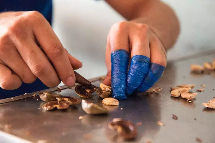在机械剥壳设备应用之前,给腰果去壳是件艰巨的任务,先要把腰果晒干,然后将它们放在火上烤,直到大部分有毒的腰果壳油散去,果壳炸裂,才能取出果仁。当然,即使有手套的保护,去壳工人也时常会受到腰果壳的毒害。