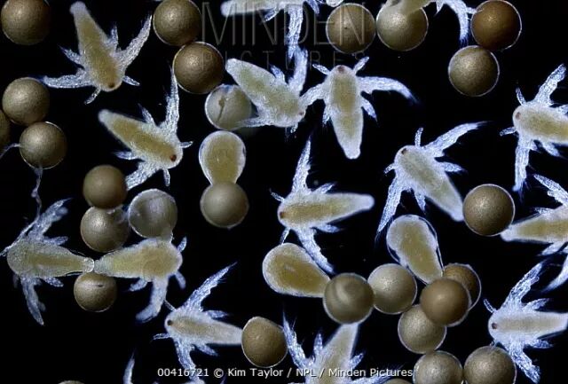 它们以单细胞藻类和有机碎屑为主要食物,最适宜的生长温度为25~30℃。图中为丰年虫卵和刚孵化的幼体。图片:Kim Taylor / NPL