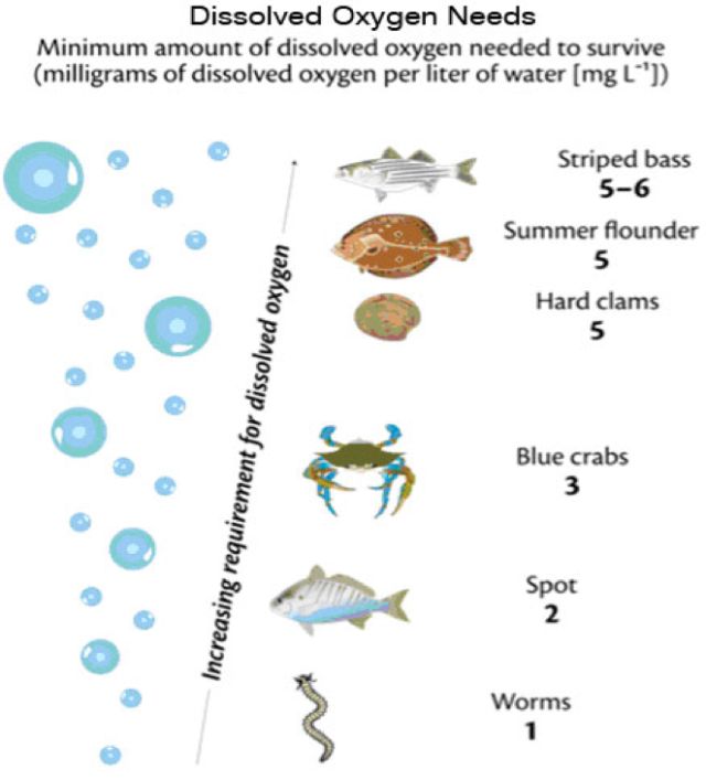 几种水生生物对溶解氧的最小需求。图片:watershedcounts.org