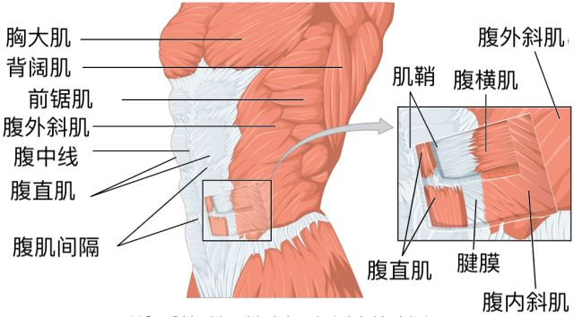 人体腹部肌肉图解,腹直肌就是我们用来弯腰、仰卧起坐和表演美人鱼的主要肌肉。图片:OpenStax College / wikimedia.org;汉化:卢平