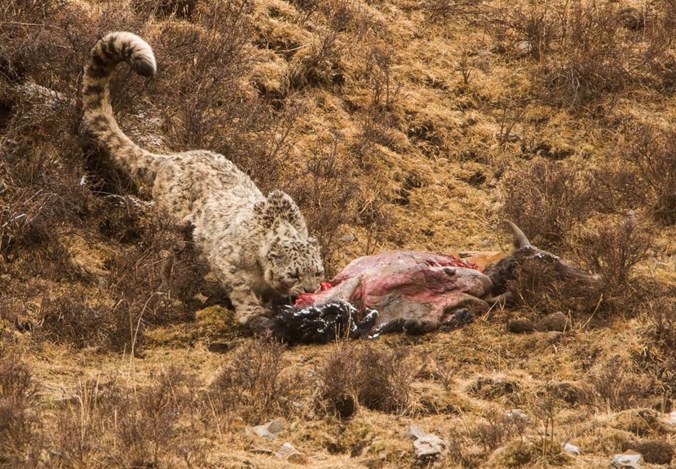 一只雪豹正在享用牦牛肉。图片:Frederic Larrey
