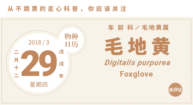 今天的日历主角——毛地黄(Digitalis purpurea),看名字就知道跟地黄有着密切关系。它曾经与地黄同为玄参科(Scrophulariaceae)植物,但后来经过现代分子生物学的研究,二者分道扬镳,地黄去了列当科(Orobanchaceae),而毛地黄去了车前科(Plantaginaceae)。