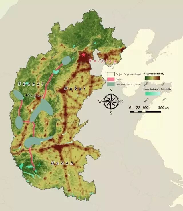 致力于“带豹回家”的猫盟CFCA(中国野生猫科保护机构)预测绘制的<华北豹>扩散廊道,灰色是现存的华北豹适宜栖息地,红色的线是豹子的潜在扩散之路。图片:周滢 / 猫盟CFCA