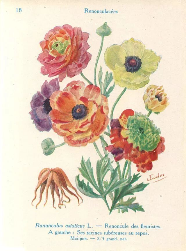 各色花毛茛和它们的“爪子”。图片:Hans-Simon Holtzbecker / Wikimedia commons