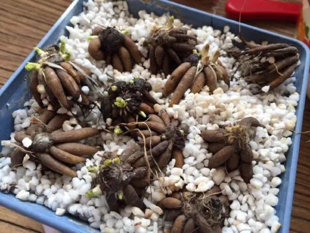 已经发芽的花毛茛块根,新的切花品种的块根较小却很有能量。图片:Keguri
