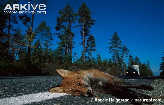 死于路杀的赤狐。图片:Asgeir Helgestad / naturepl.com