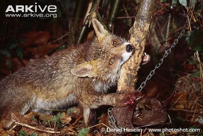 生活在人类附近的动物也容易面临一些问题,如果说路杀是人类活动中无意对于野生动物造成的伤害的话,对于下图被夹子夹中的赤狐,人类就没什么可辩解的了: