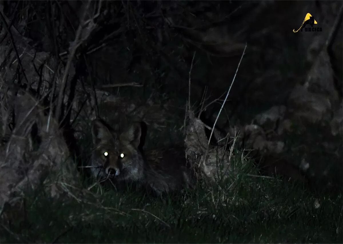 回到文章开头那只我没有尿到的赤狐。在那一夜之后,大概我们又见过面。那是在今年5月猫盟又一次前往山西项目地的时候,夜晚,我们开车寻找夜行动物,在同一个村子,同样接近房屋的位置,我们又遇到了一只赤狐。我们有充分的理由相信,它就是那位躲过我尿的家伙。这次,它没有躲过大猫的相机: