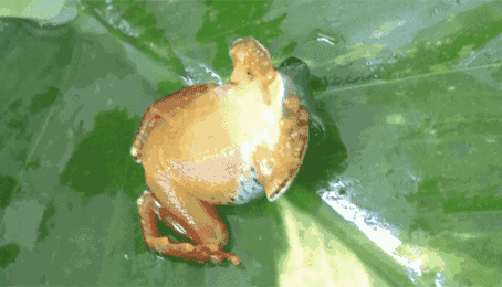 莫氏树蛙的腿部内侧有橙红色的皮肤、黑色的斑纹,那可以吓唬捕食者。如果吓唬不成,它可能会……装死!将自己整个身体翻过来,静候敌人离开, 可以说是个小戏精了。
