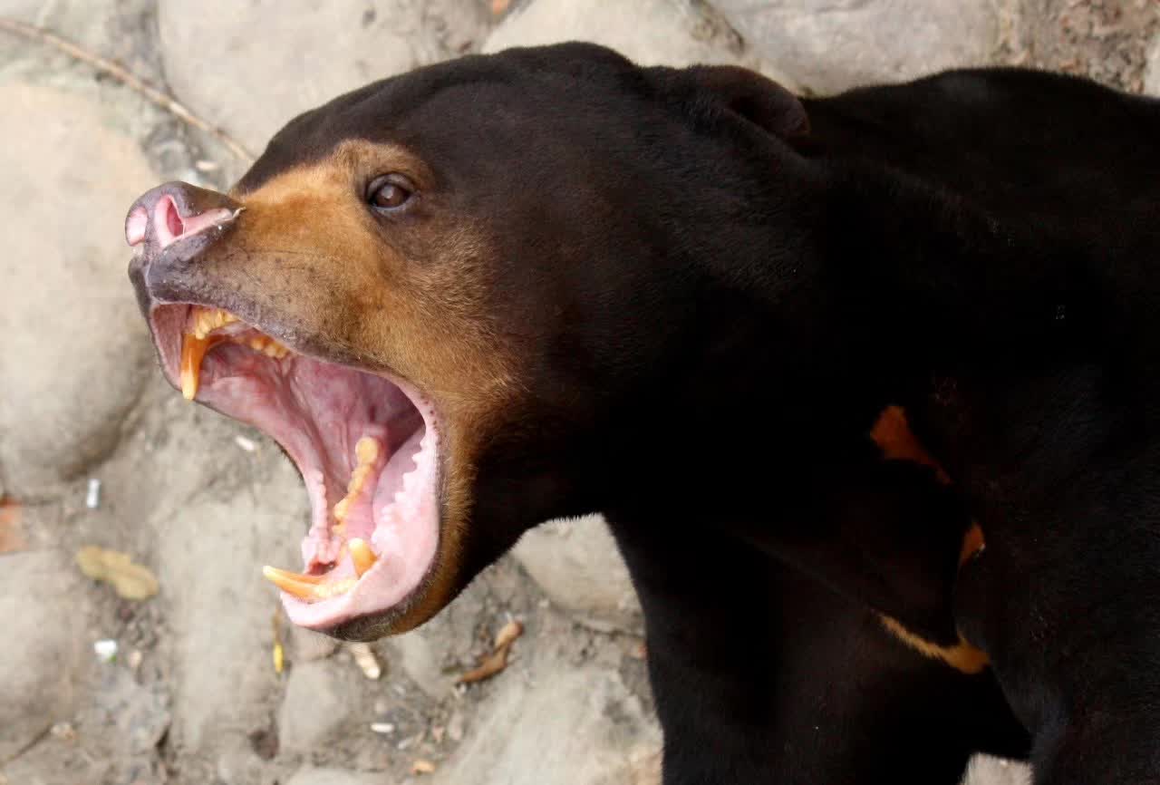 虽然体型小,但马来熊的头比较大。它的犬齿又粗又长,论尺寸几乎是熊科之最,论咬合力竟然不输给体型大两圈的棕熊,更是远超黑熊和懒熊。