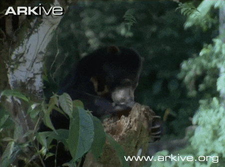 它们也很喜欢吃蚂蚁;图片中的马来熊扒拉着朽木,舔食着蚂蚁一类。图片:arkive