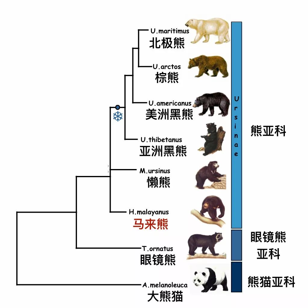 在熊亚科内部,分布在印度次大陆的懒熊、东南亚的马来熊以及更北边的亚洲黑熊三个物种亲缘关系较近,另外还有北美的美洲黑熊、北半球广泛分布的棕熊和生活在极地的北极熊这些大块头。