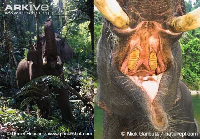 亚洲象苏门答腊亚种,你可能没看过张口的大象,它们并不靠长牙来咀嚼。左图:Daniel Heuclin;右图:Nick Garbutt