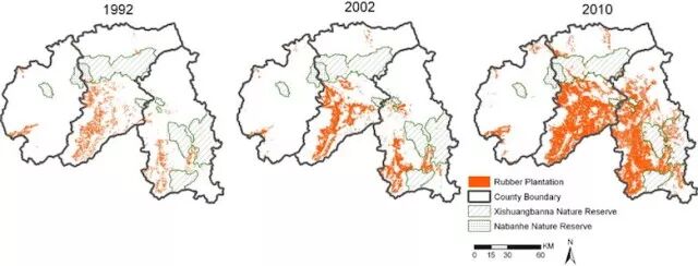 18年间西双版纳橡胶林数量的增加,橘色为橡胶林。图片:Ecological Indicators(2014)