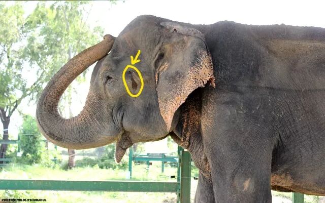 进入“狂暴期”的亚洲象,注意眼睛后方的分泌物。看到这个特点就可以判断:虽然没有象牙,但这是个雄性个体。图片:Mradul / wildlife sos