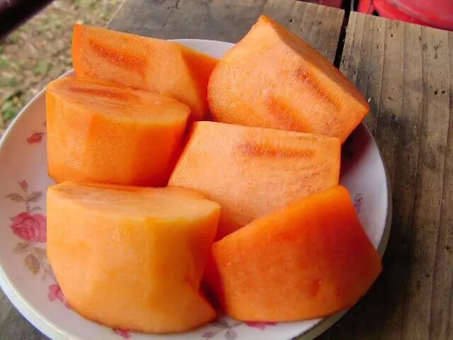那么,有没有“釜底抽薪”的方式,一劳永逸的解决柿子涩嘴的问题呢?有的。那就是甜柿品种。甜柿品种果实内部的可溶性单宁本身就远低于涩柿,只有后者的十分之一左右,因此直接采摘后就可食用,而且口感也并不像脱涩后的涩柿那样绵软,而是更为爽脆。甜柿品种主要来自日本,而我国的罗田柿,则是为数不多的原产我国的甜柿品种。