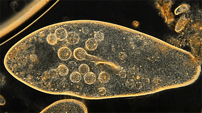 在显微镜下你可以和草履虫玩的游戏很多。比如加几粒盐观察它们逃离,滴一点蓝墨水看它们放出刺丝泡、变得怒发冲冠,或者用亚甲基蓝把它染成浅蓝色,就可以看清大细胞核和食物泡,还能看到两个伸缩泡交替收缩的过程。运气足够好的话,你还能看到正在进行分裂甚至接合生殖的草履虫。玩够了以后把培养液放进冰箱冷藏室,能保存数月之久。