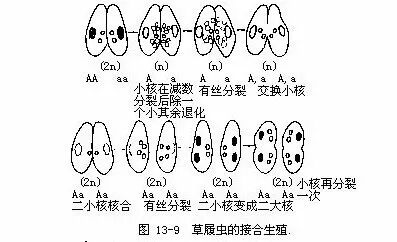 大草履虫的接合生殖过程极为复杂。简略地说,就是两个虫体的口沟接合在一起,大核消失,小核经过多个分裂、交换、融合、解体的过程,最终分裂出8个与上一代接合型不同的新个体。具体过程请看下面的图,如果还没有感到眩晕并且有兴趣的话,可以自己去找资料详细了解。