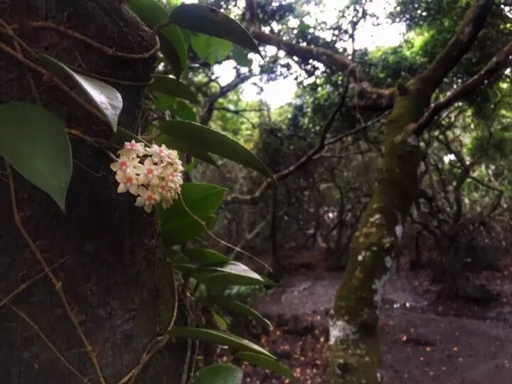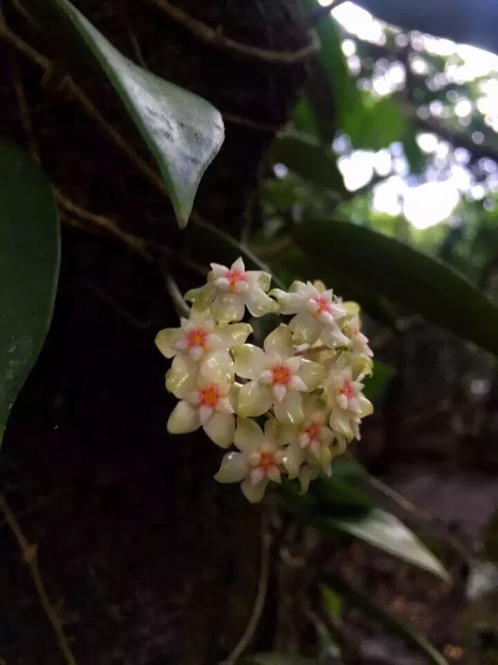 除了在花市中能见到球兰,你还能在我国南方诸省,如福建,两广,云南,海南和台湾的深山密林中发现它们的身影,许多年前,我在鼓浪屿的一处残垣上,就偶遇一蔓球兰,像一张绿毯,将斑驳的墙面紧紧包围,就像是用生命在墙上作画。而东南亚则是球兰物种多样性的热点地带,终年潮湿而温暖的气候为球兰提供了最适生长条件,在泰国就随处可见球兰和树眼莲属,以及其他兰科植物被培植在行道树上。