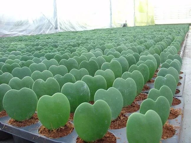 这实际也是一种球兰,名字叫心叶球兰Hoya kerrii,拥有厚实多肉的革质叶片,有个自然的缺刻,看起来就像是一颗爱心。正如这样,它们成为为数不多的一种观叶球兰,商家为了快速出货,会摘取它们的叶片,等伤口晾干后插进介质中培养,不久便会生根。