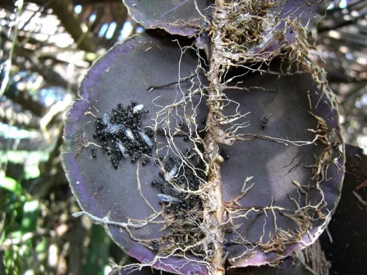 当然“锅贴皮”的包着的,可不是什么可口的“馅料”,而是一群群蚂蚁和蚁冢昆虫(myrmecophile animals 蚁类的客居或寄生昆虫)。这种球兰和昆虫们形成了一种共生关系:宽大的肉质叶为昆虫提供了庇护所,供其生存和繁殖。反过来,昆虫们产生的代谢物可以被叶背面的网络根系所吸收,大自然真是无奇不有。