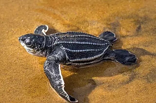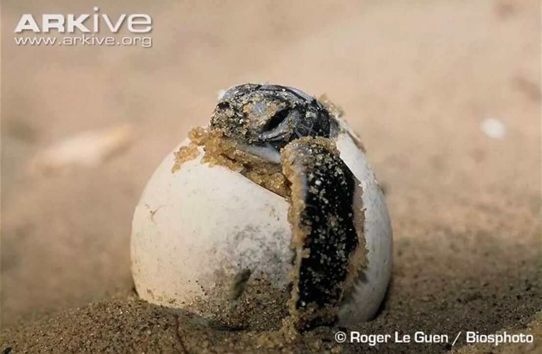 海龟卵埋在沙子中孵化45~70天,新生小海龟的性别与孵化温度有关。卵堆中间温度比较高,通常孵出雌性;卵堆外围温度较低,通常孵出雄性。小海龟会用一次性的“蛋牙”将蛋壳打破,挣扎出壳后还要拨开重重的沙子才能奔向海洋。