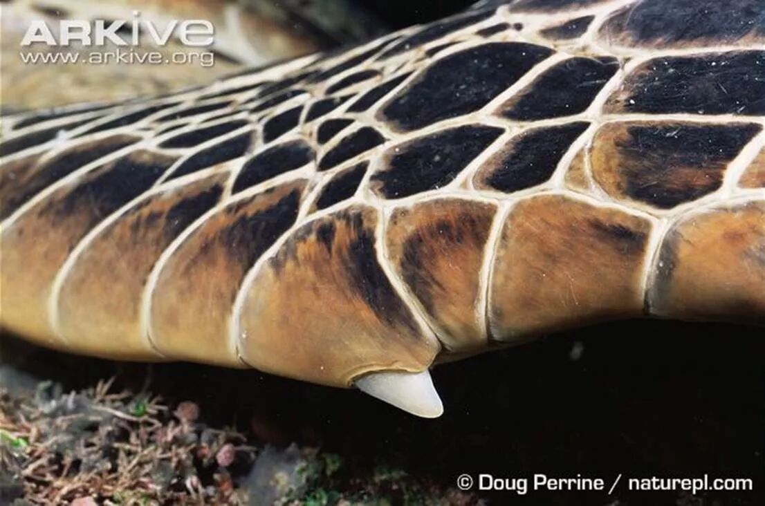 可能是我们最耳熟的海龟,它最具特色的应该是鹰嘴般的喙。前额鳞两对;背甲后半边缘锯齿状,侧盾4个,椎盾5个,盾片呈覆瓦状排列(海龟中仅有),色彩斑斓的盾片常被用来制作珍贵的装饰、配饰,或是整个个体制作成标本摆设。目前群体状况为极危(CR)。