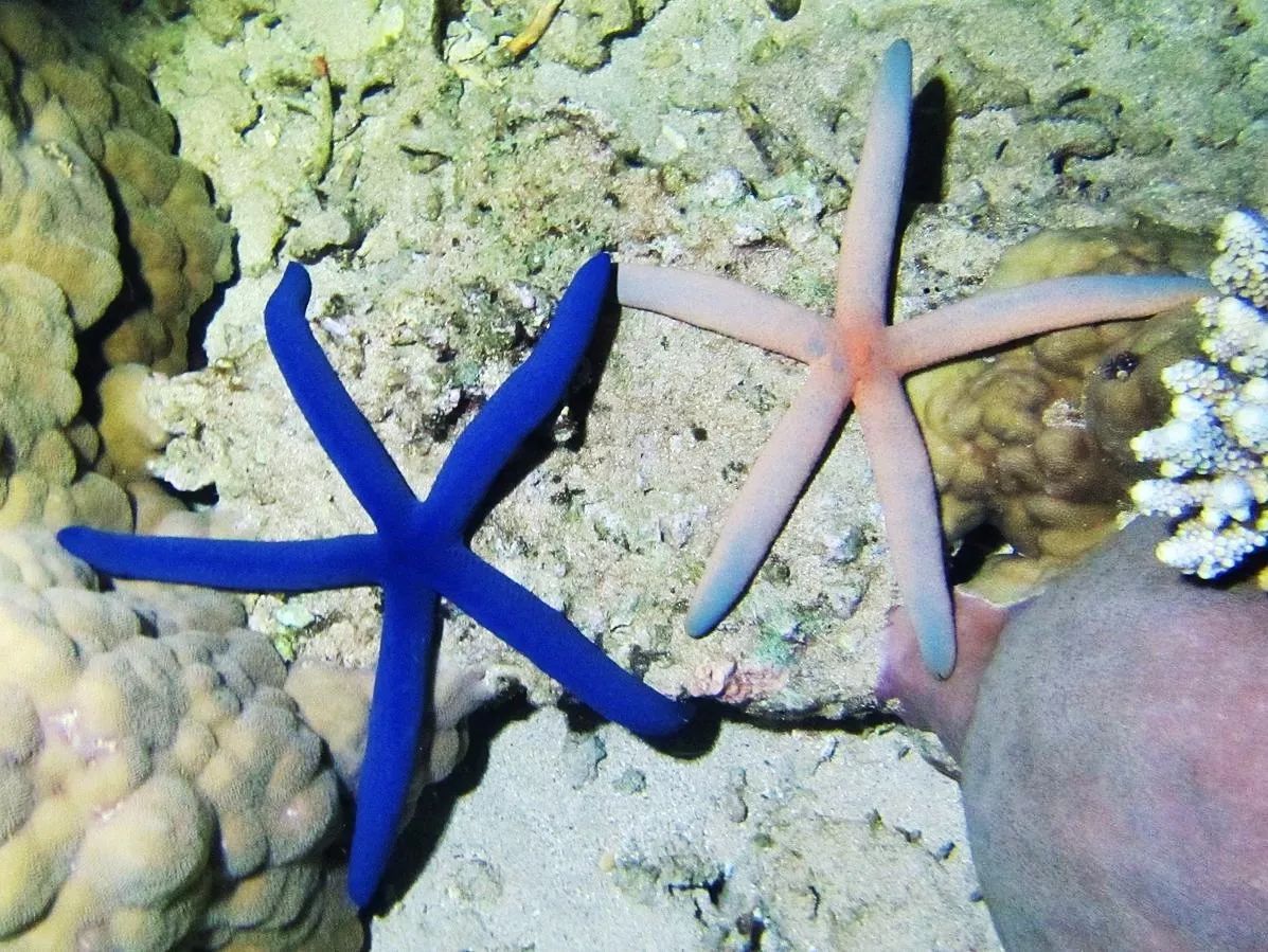 两只颜色不同的蓝指海星,摄于Mayotte。图片:Frédéric Ducarme / wikipedia