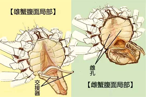 公蟹的蟹脐狭长,称尖脐,易于打开;母蟹的较圆阔,称团脐,利于护卵。蟹脐下长有腹肢,母蟹有四对,伴生有刚毛,用于附着蟹卵;公蟹的腹肢则特化为一对威猛的交接器,它的唯一使命就是传宗接代。